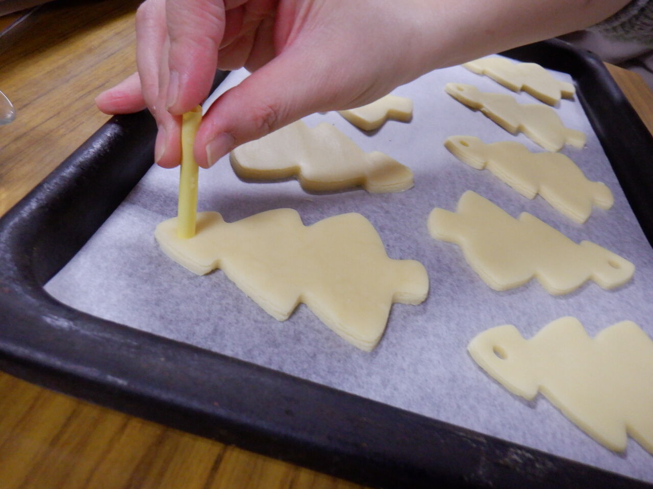 ツリーの形の生地に穴を開けて、、、