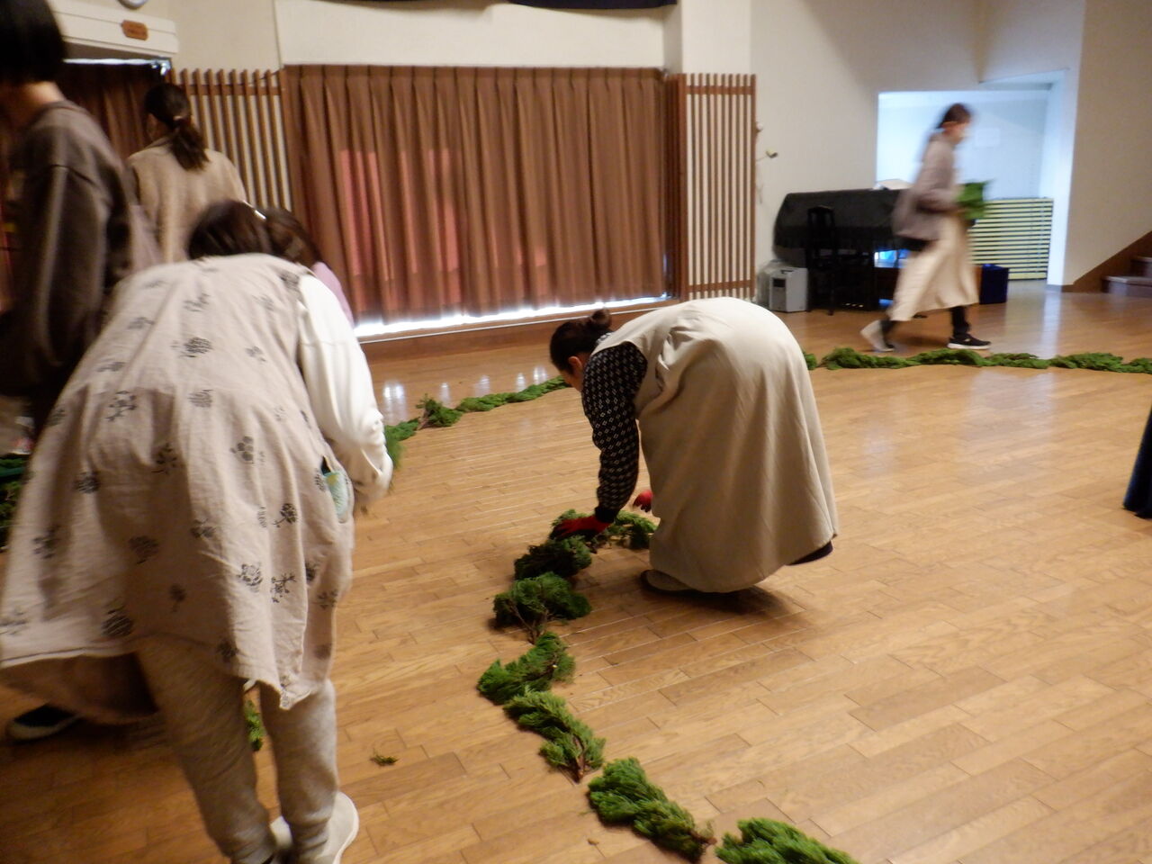 モミの木の渦の中を年中さんが担任と歩んでいきます。