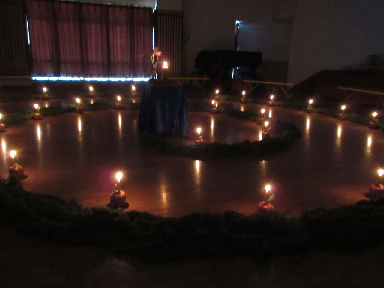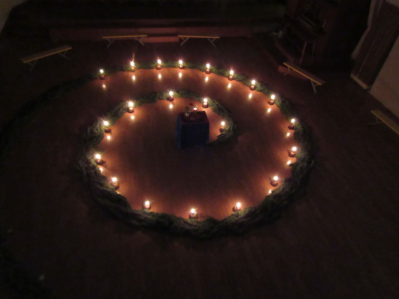 中央にたどり着いたとき、自分のろうそくに火をつけ、来た道をゆっくりと戻って。